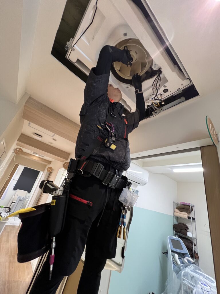 「**エアコンから黒いカスが落ちてくる**」「**変な匂いがする**」とのことで、お困りの様子でした。